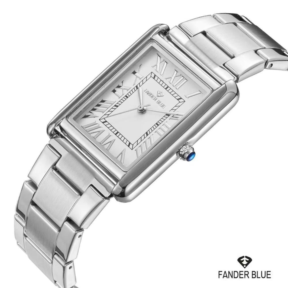 ساعة رجالية بتصميم مستطيل كلاسيكي عالمي قطعة تُكمل البدلة كما تُرتّب إطلالة العمل اليومية. علبة وسوار من ستانلس ستيل بتشطيب فضي لامع يمنح حضورًا راقيًا، مع مينا متعددة الطبقات ونقش هندسي أنيق يضيف عمقًا بصريًا وفخامة هادئة، وأرقام رومانية تزيد الطابع التراثي دون أن تفقد الساعة روحها العصرية.